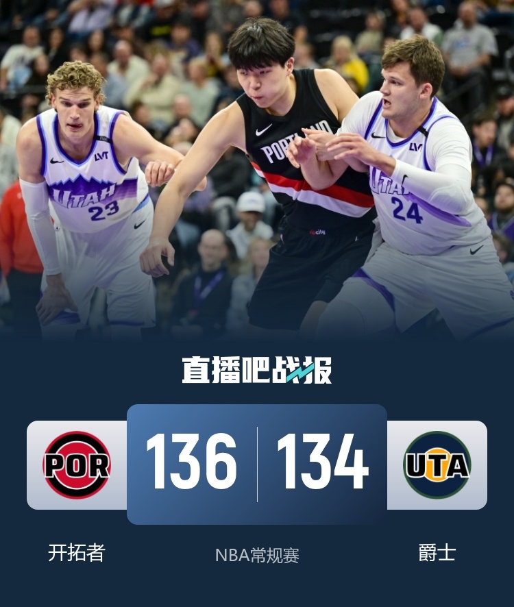 开拓者(3-2):杨瀚森2分、霍勒迪27分5板8助2断、阿夫迪亚19分9板5助、夏普18分4板、格兰特18分3板1助2断、卡马拉17分4板5助2断、韦斯利10分2板3助2断、里斯9分1板2助、克林根5分7板4助3帽、乐福5分1板4助、吕佩尔3分3板1助2断、塞布尔3分1助2断。