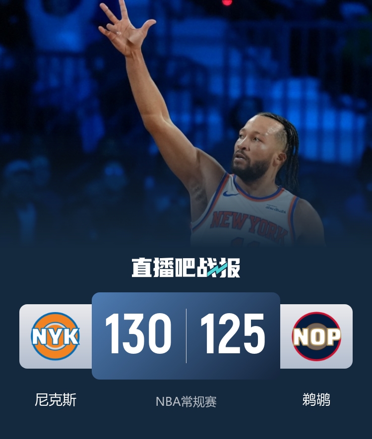 首节开打后萨迪克·贝手感炸裂三分5中4狂轰23分,布伦森连造杀伤及时止血,迪亚瓦拉连中三分续上火力,首节结束时鹈鹕领先4分,次节回来,阿努诺比突然爆发单节独得16分,但锡安连投带罚强势回应,鹈鹕稳扎稳打守住优势,半场战罢,鹈鹕依然领先3分。短暂休整后两队进攻火力放缓,普尔和锡安联手取分,鹈鹕领先7分进入末节,末节决战,两队鏖战至最后时刻,尼克斯连中三分实现反超,锡安连续单打保留悬念,麦克布莱德连中罚球后鹈鹕追分未果,最终尼克斯130-125力克对手。